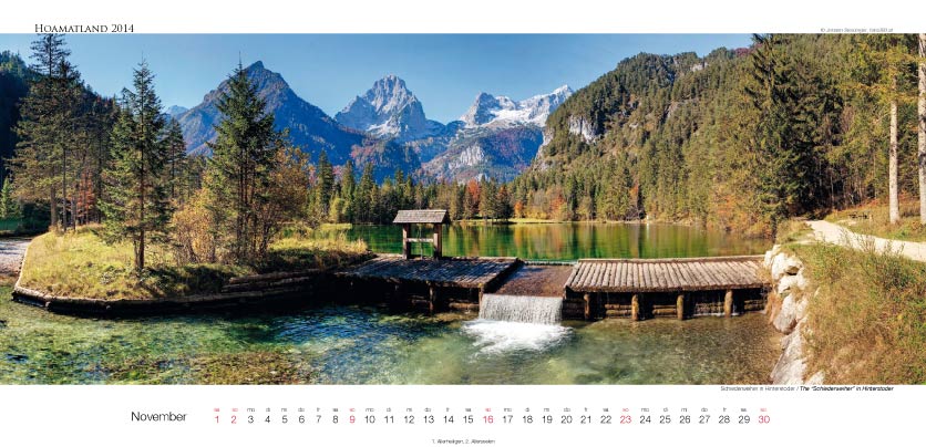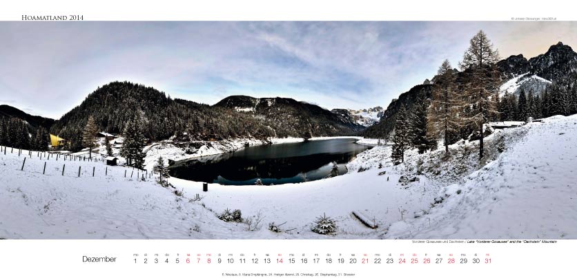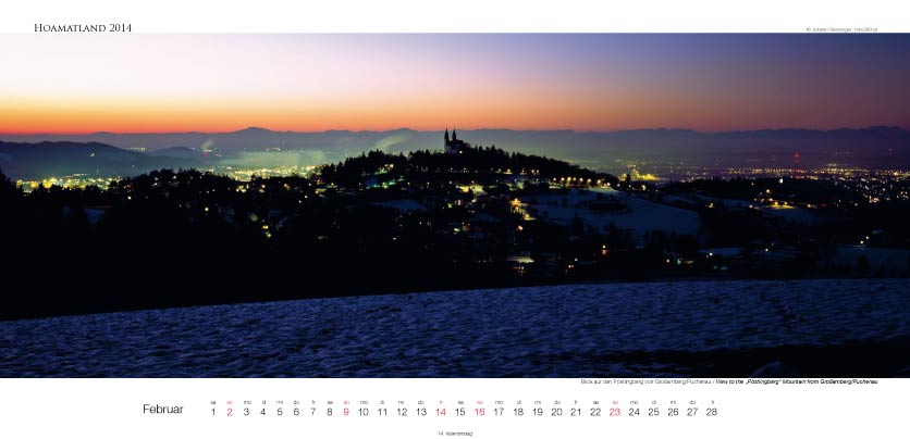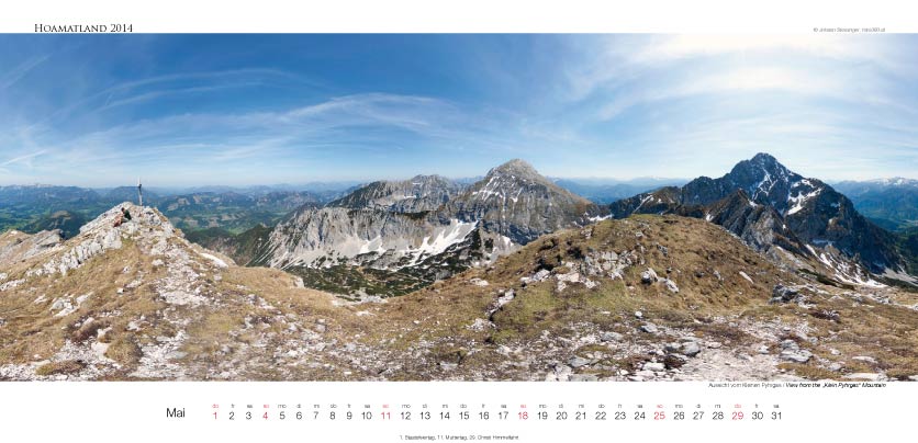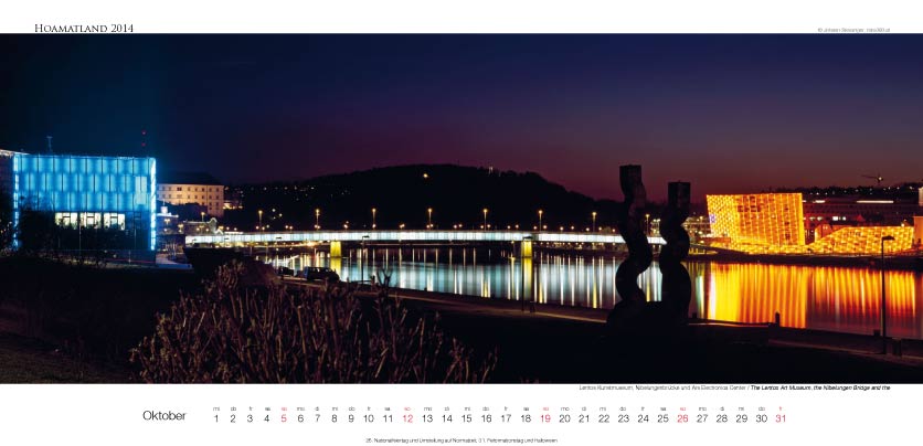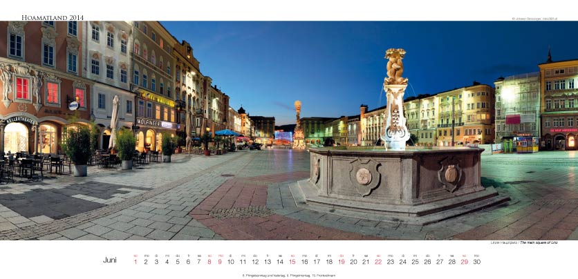 Der Oberösterreich Panorama-Kalender Hoamatland für 2014 hat ein Format von 58 x 28 cm und zeigt mit seinen Motiven die Vielseitigkeit dieses Bundeslandes im Panorama-Format. Alle Seiten sind mit einer matten Speziallackierung veredelt.