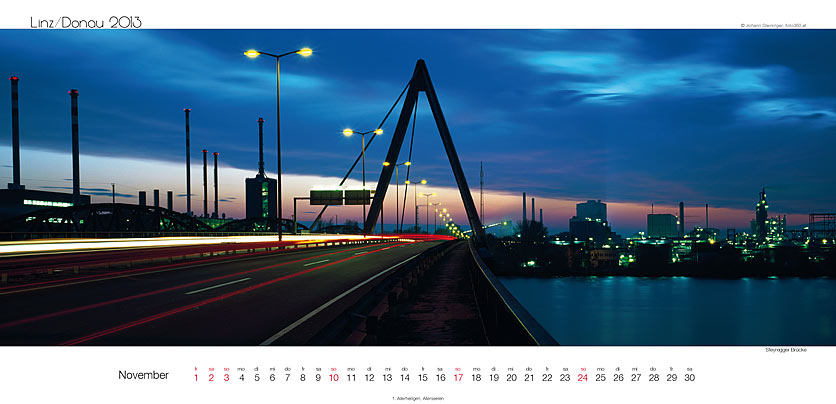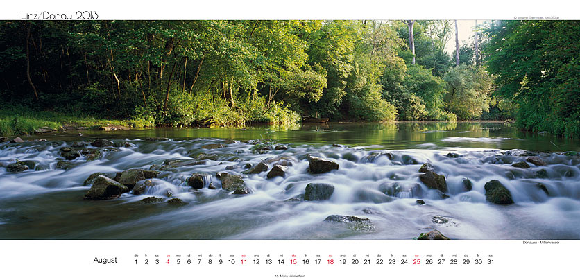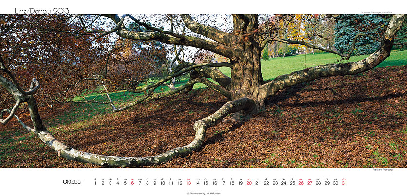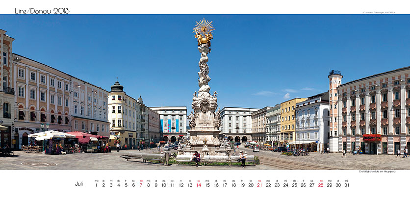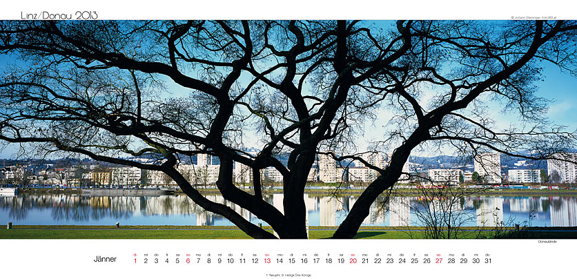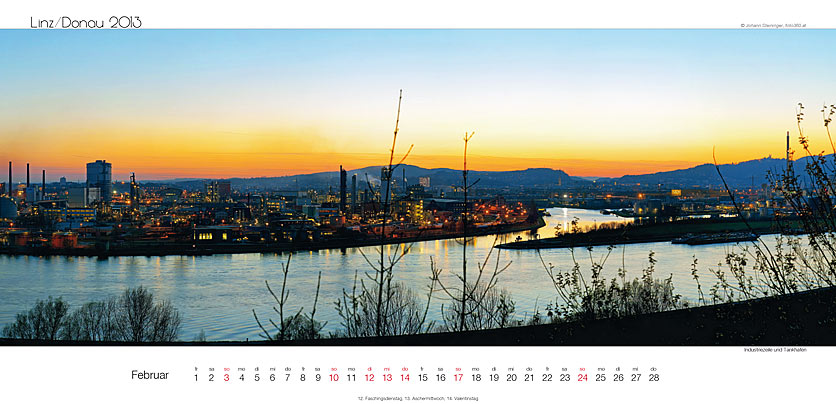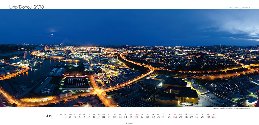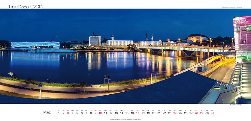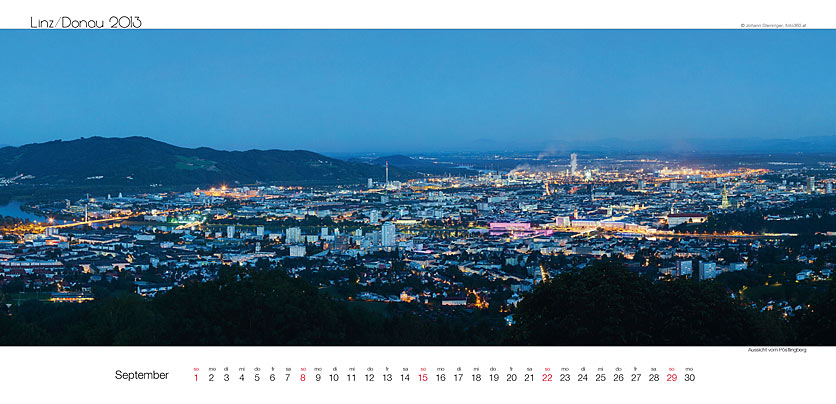 Der Linz Panorama-Kalender für 2013 hat ein Format von 58 x 28 cm und zeigt Motive zum Thema Kultur, Industrie und Natur in und um der oberösterreichischen Landeshauptstadt. Alle Seiten sind mit einer matten Speziallackierung veredelt.